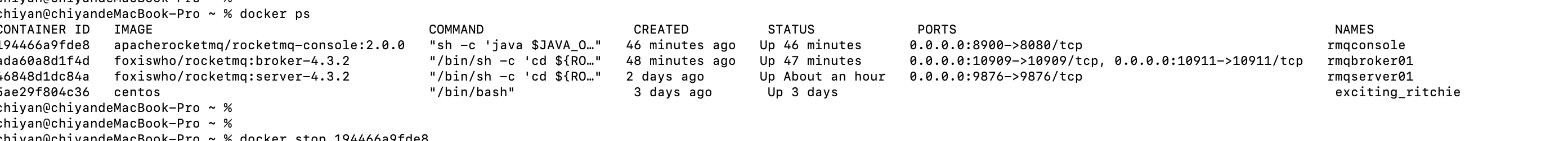 // nameserver docker run -d -p 9876:9876 -v /Users/chiyan/dockerrocketmq/rmqserver01/logs:/root/logs -v /Users/chiyan/dockerrocketmq/rmqserver01/store:/root/store --name rmqnamesrv -e "MAX_POSSIBLE_HEAP=100000000" ffoxiswho/rocketmq:broker-4.3.2