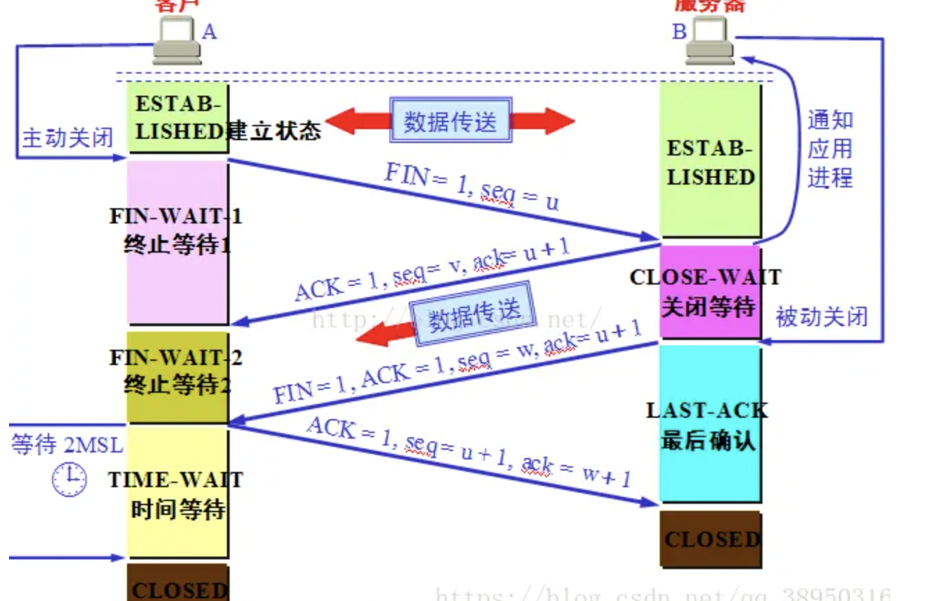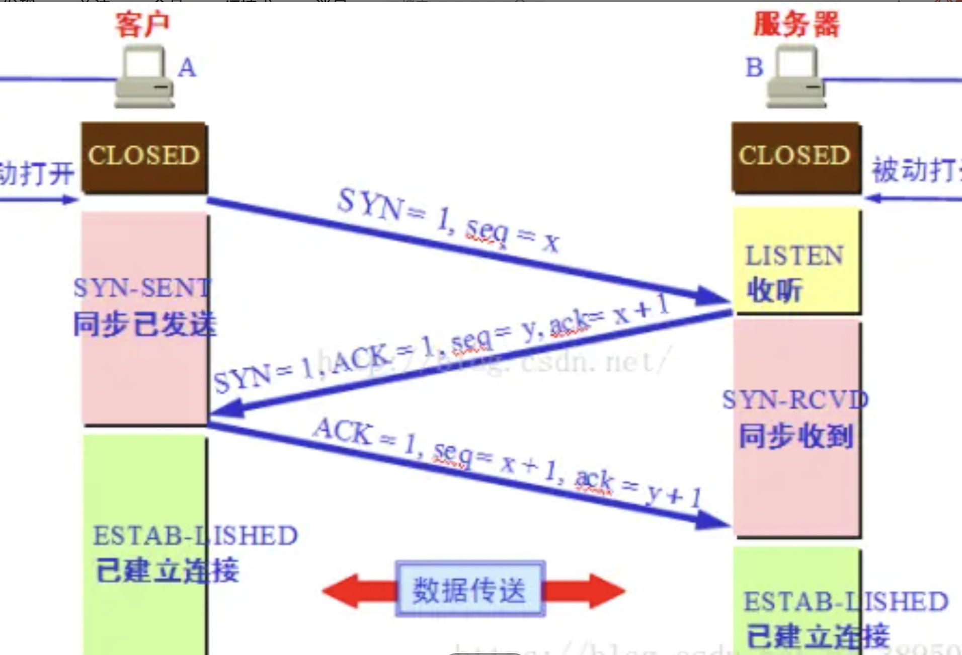 A客户端 -> B服务端 A ---- seq(x),SYN ------ > B B ---- seq(y),ack(x+1),ACk ---- >A A ---- ack(y+1),seq(x+1),ACK --- > B