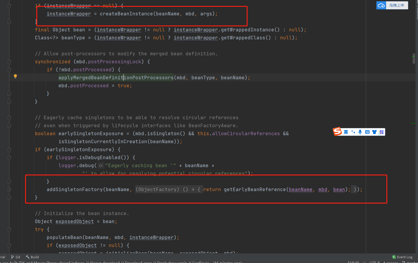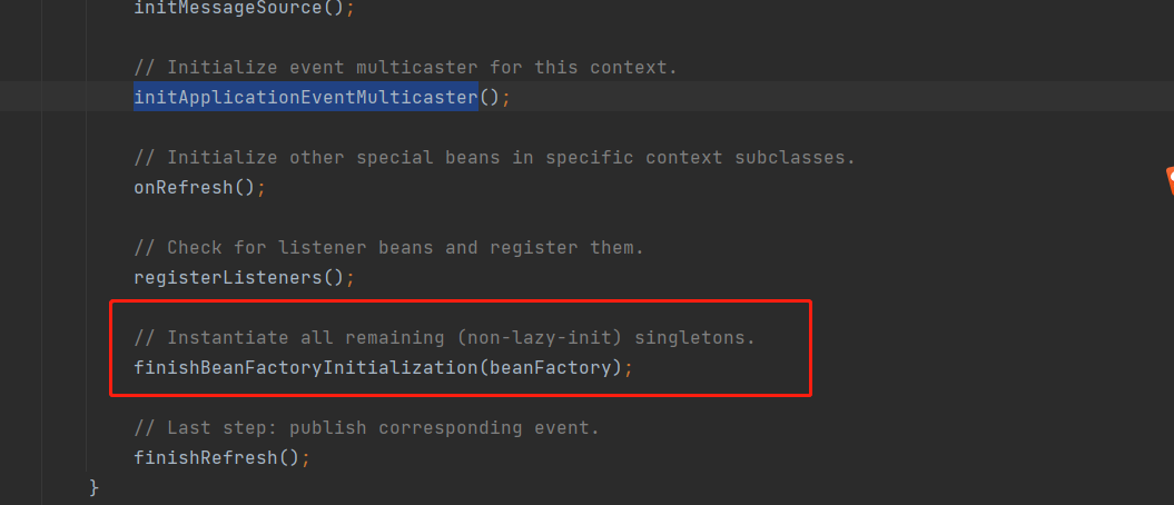- 这里涉及代理对象的生成,但是在aop中,出现循环依赖,代理对象需要提前暴露不能在最后暴露所以,在finshbeanfactoryinitialization里面中的createInstance之后设置属性之前调用