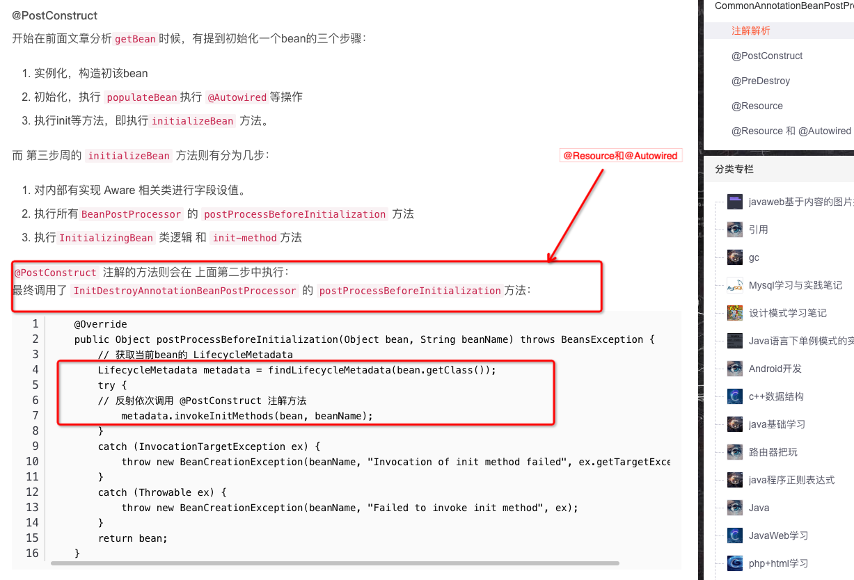 - 在用户bean创建过程中(doCreateBean),实例化(createBeanInstance)之后,通过执行applyMergedBeanDefinitionPostProcessors方法,实现@Autowired注解元数据的预解析