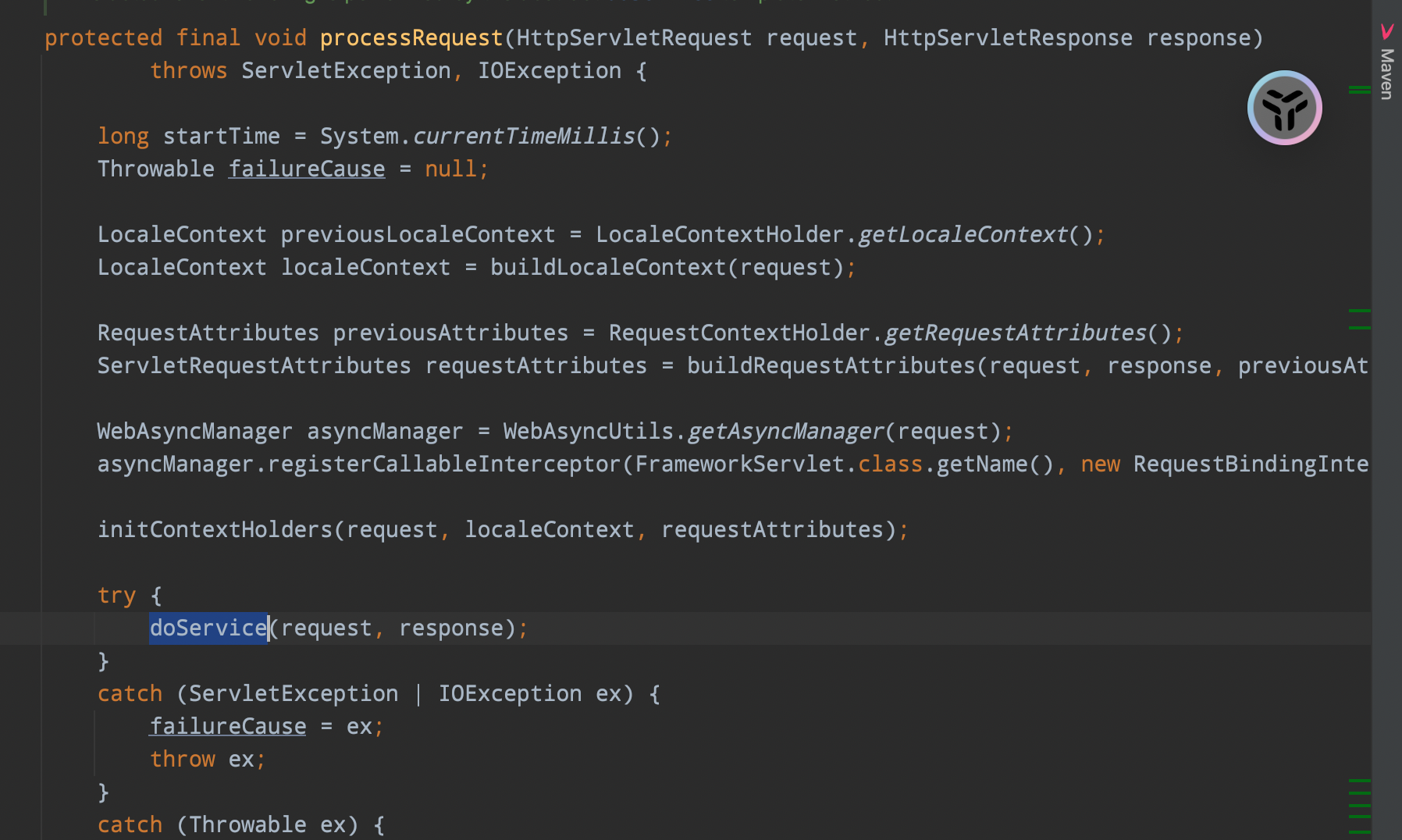 3. FrameworkServlet 的 service(HttpServletRequest request, HttpServletResponse response) 方法,用于处理请求