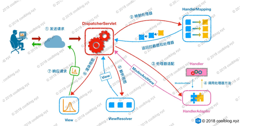 除了会初始化一个 Root WebApplicationContext 容器外,注入一个 DispatcherServlet 对象,初始化该对象的过程也会初始化一个 Servlet WebApplicationContext 容器 HttpServletBean : 负责将 ServletConfig 设置到当前 Servlet 对象中 FrameworkServlet: 负责初始化 Servlet WebApplicationContext 容器;该类覆写了 doGet、doPost 等方法,并将所有类型的请求委托给 doService 方法去处理,doService 是一个抽象方法,需要子类实现 DispatcherServlet: 负责初始化 Spring MVC 的各个组件,以及处理客户端的请求,协调各个组件工作
