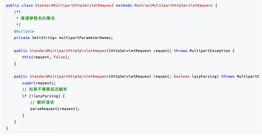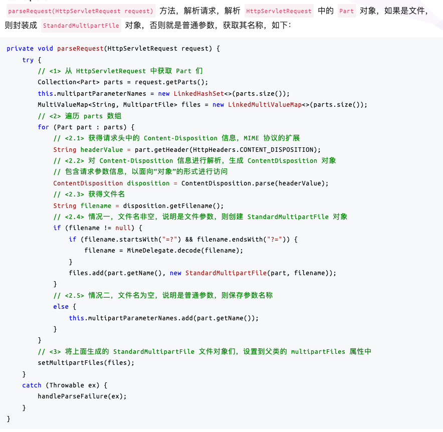 1. 由 Servlet 3.0 提供 API 获取请求中的 javax.servlet.http.Part 对象,然后进行解析,文件会封装成 StandardMultipartFile 对象