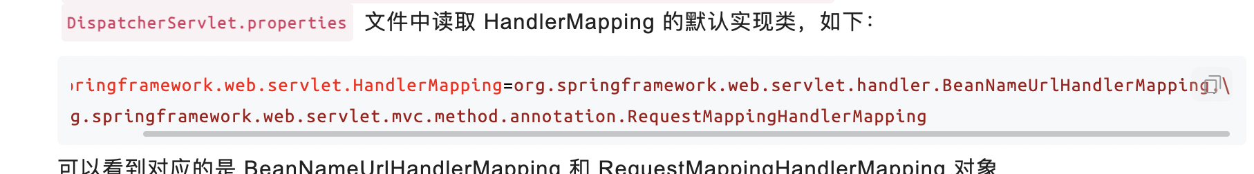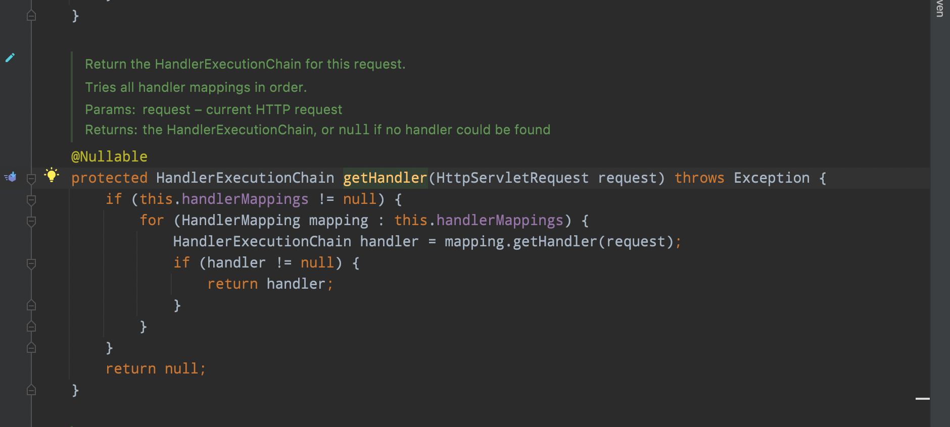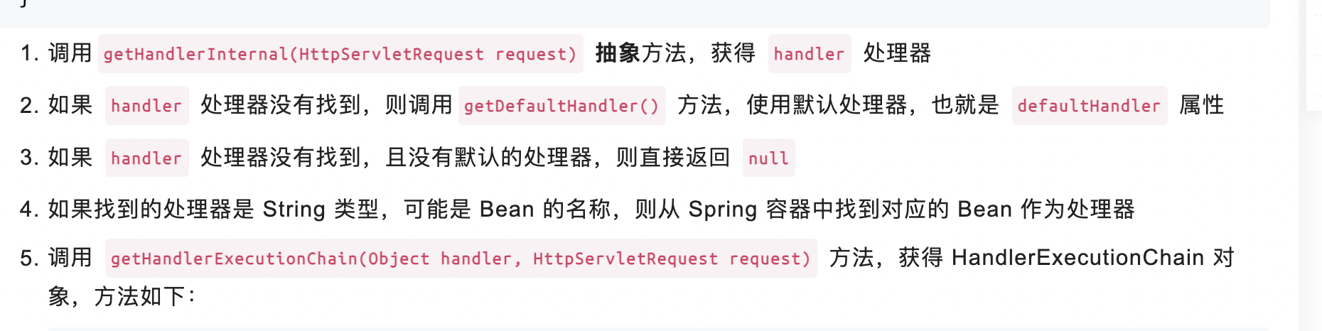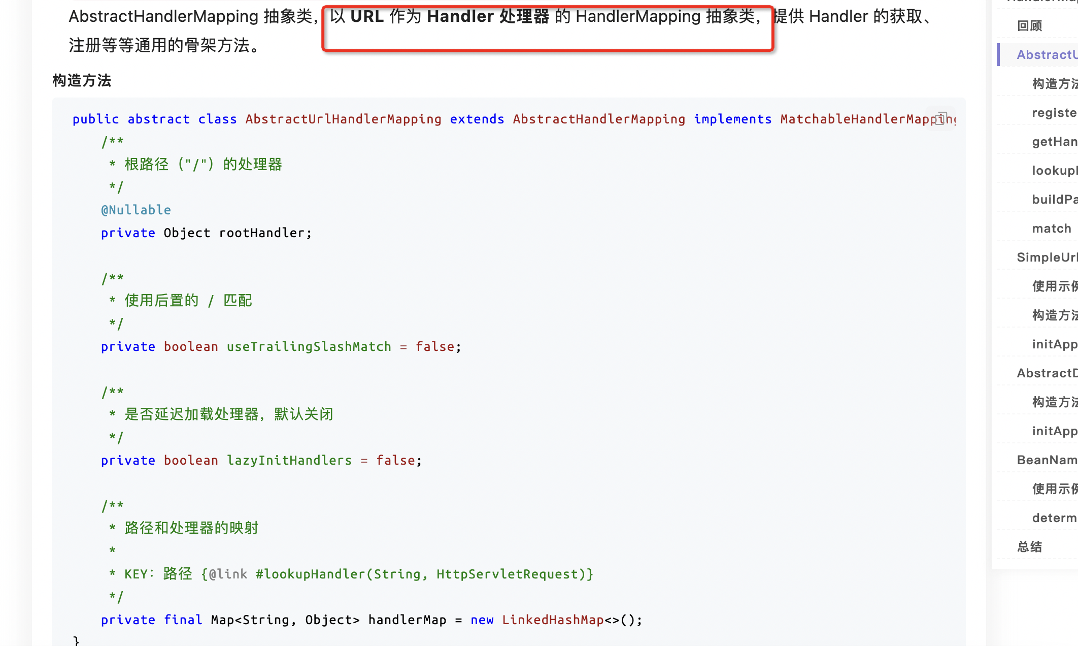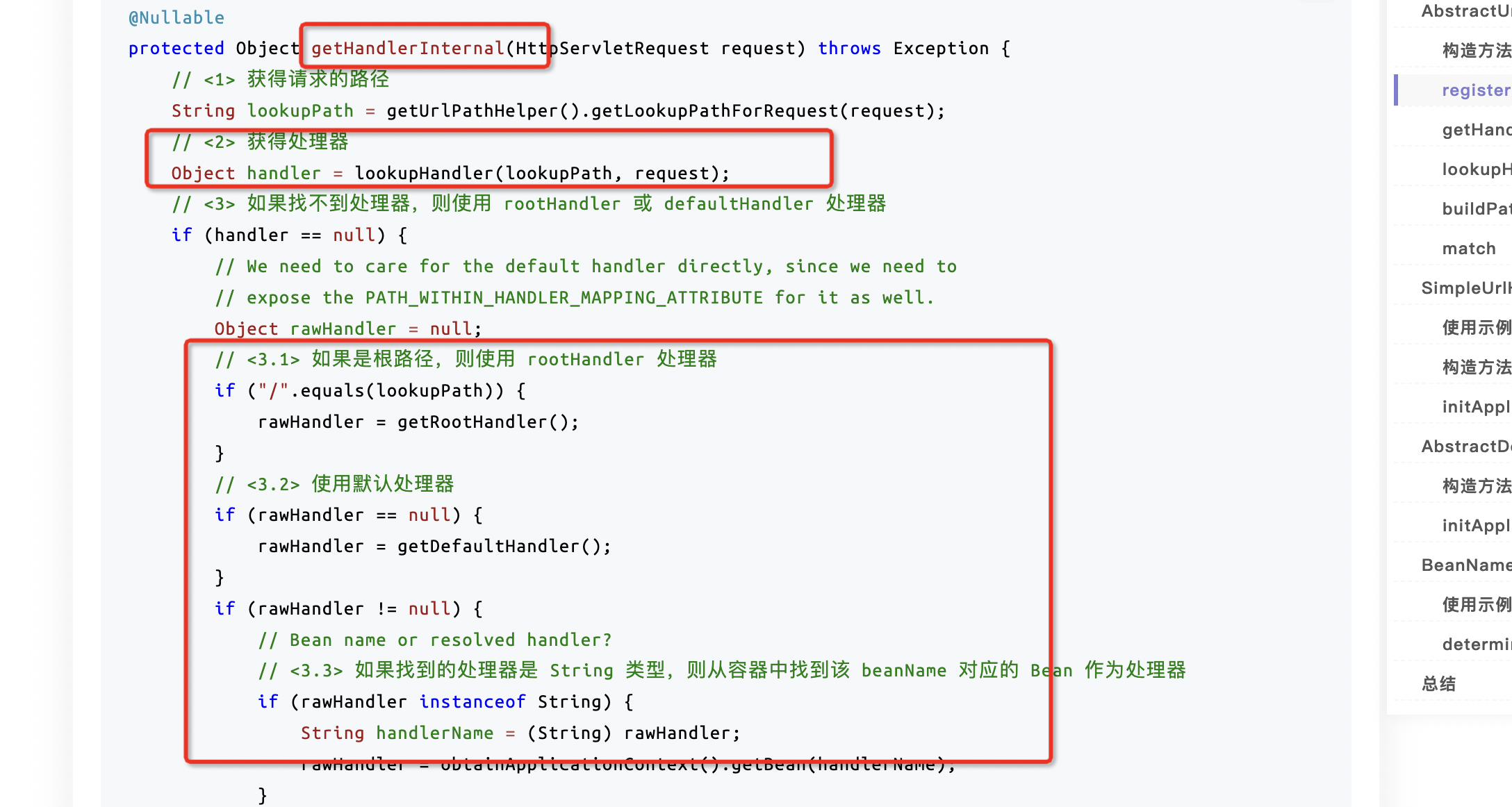 HandlerMapping 组件,请求的处理器匹配器,负责为请求找到合适的 HandlerExecutionChain 处理器执行链,包含处理器(handler)和拦截器们(interceptors)handler:处理器是Object类型,可以将其理解成HandlerMethod对象(例如我们使用最多的@RequestMapping注解所标注的方法会解析成该对象),包含了方法的所有信息,通过该对象能够执行该方法 HandlerInterceptor:拦截器对处理请求进行增强处理,可用于在执行方法前、成功执行方法后、处理完成后进行一些逻辑处理 通过HandlerMapping 获取链路是有顺序的,获取奥chain后就不会后面的遍历 BeanNameUrlHandlerMapping -> RequestMappingHandlerMapping 红色框用于解析:@RequestMapping 黄色框通过配置文件配置url路径 initHandlerMappings: 两个默认实现类gettHandler getHandler(HttpServletRequest request) 方法,获得请求对应的 HandlerExecutionChain 处理器执行链,包含处理器(handler)和拦截器们(interceptors) 总结:AbstractHandlerMapping 抽象类,作为一个基类,实现了“为请求找到合适的 HandlerExecutionChain 处理器执行链”对应的的骨架逻辑,而暴露 getHandlerInternal(HttpServletRequest request) 抽象方法,交由子类实现。 这个获取handler后面痛过getHandlerExecutionChain 获取处理器和过滤器:HandlerExecutionChain