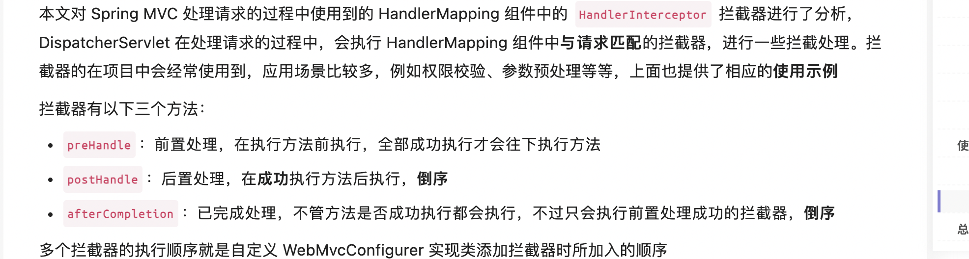 HandlerInterceptor 拦截器对处理请求进行增强处理,可用于在执行方法前、成功执行方法后、处理完成后进行一些逻辑处理 springboot中